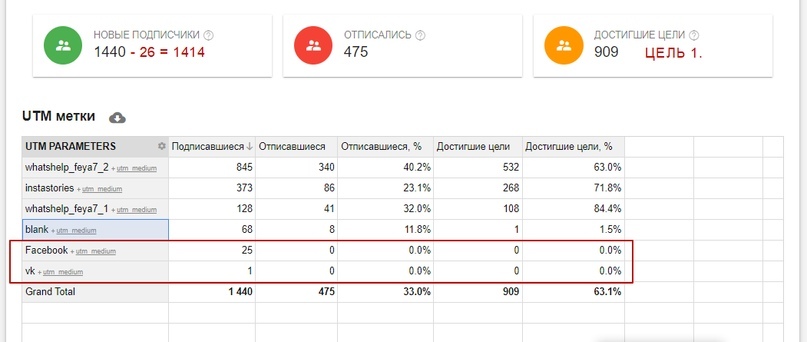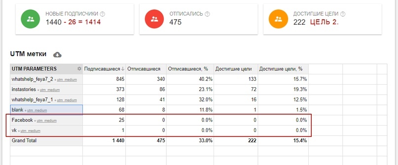 Подписались с рекламы — 1414, осталось для рассылки — 939