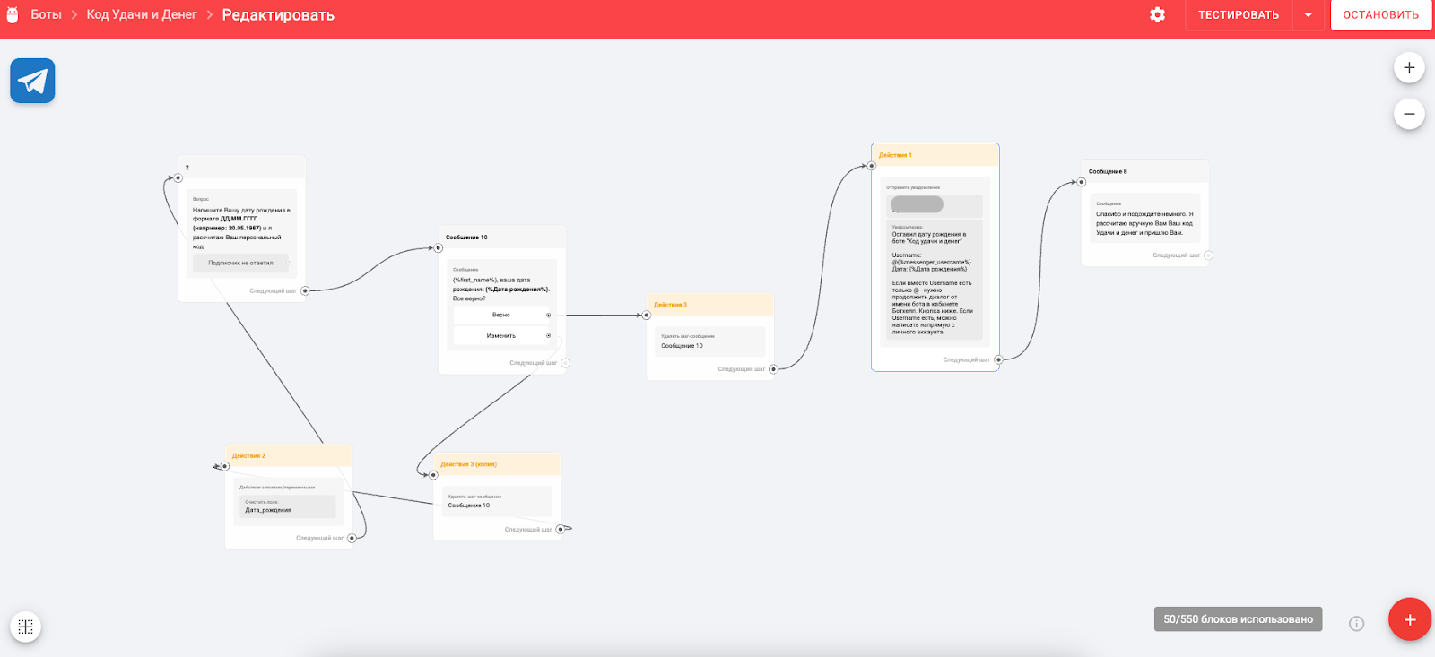 На первом этапе мы проверяем подписку на телеграм-канал. Если подписка есть, высылаем приветственное сообщение и очищаем поля «Дата рождения» и «Код». Это нужно для того, чтобы один человек мог ввести несколько разных дат рождения, при этом не получая один и тот же результат.