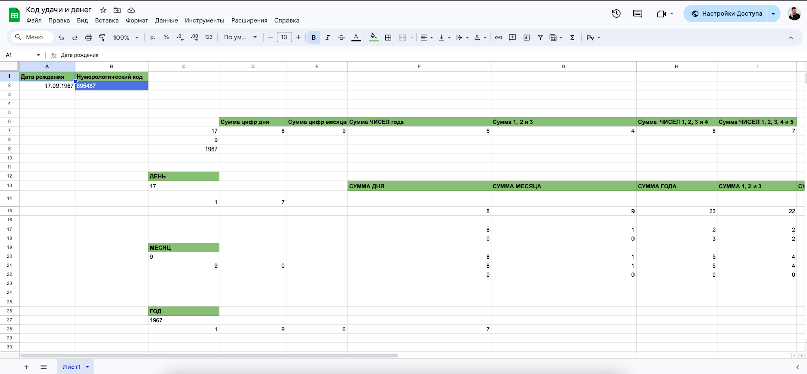Бот от нумеролога с просчëтом «Кода удачи и денег» с помощью Google-таблиц.