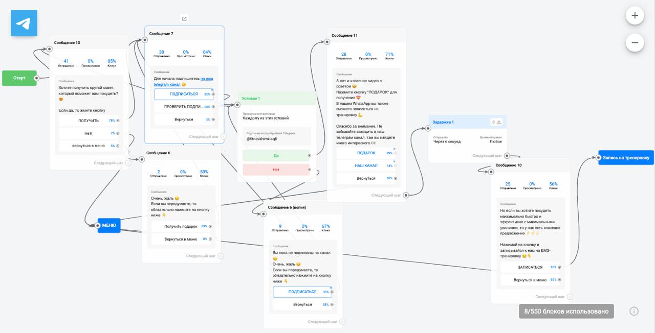 Дальше я разработал лид-магнит — создал чат-бота, который выдаёт бесплатное видео с советом, как похудеть. Бот проверял подписку на канал. Так мы не только привлекали людей в воронку, но и повышали число подписчиков на канале.