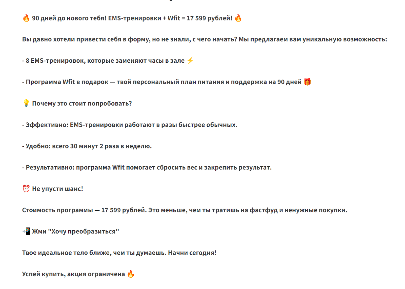 Также я регулярно добавлял контент для большего ознакомления с таким уникальным методом, как EMS-тренировки. В канале публиковалась информация о студии, тренере и преимуществах EMS-тренировок.