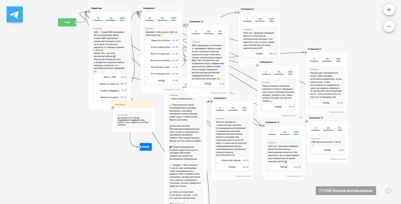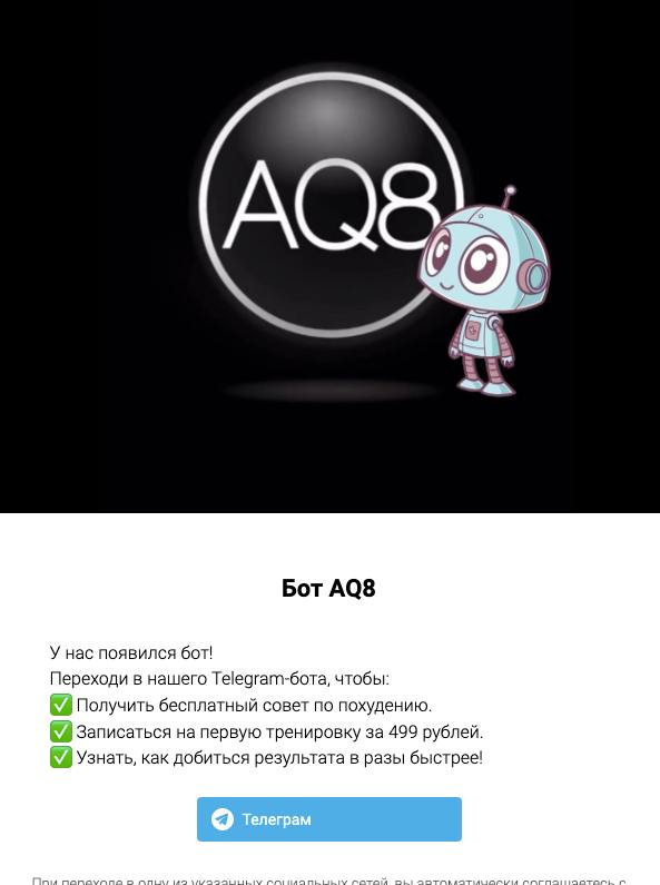Дополнительно был создан бот, который давал больше информации о студии AQ8 и EMS-тренировках, а также отвечал на часто задаваемые вопросы: