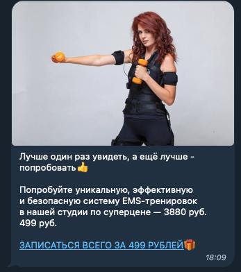 Клиенты из telegram-канала доходили на пробную EMS-тренировку в течение недели. После пробной тренировки у нас получилось продать шесть абонементов, а помогла нам в этом авторассылка.