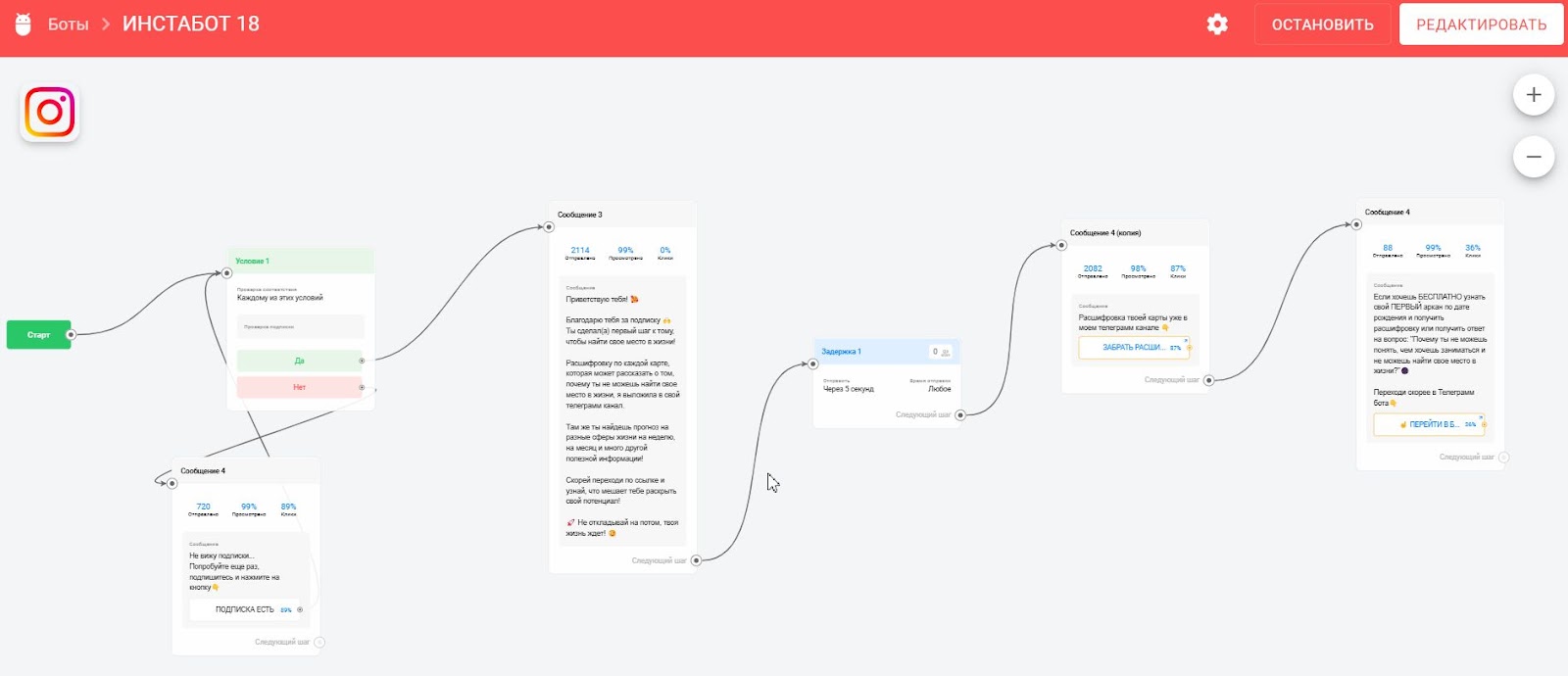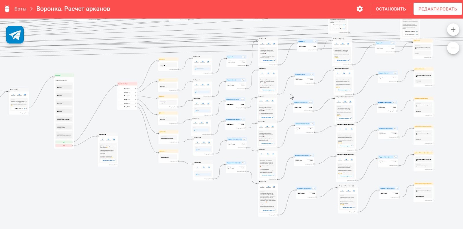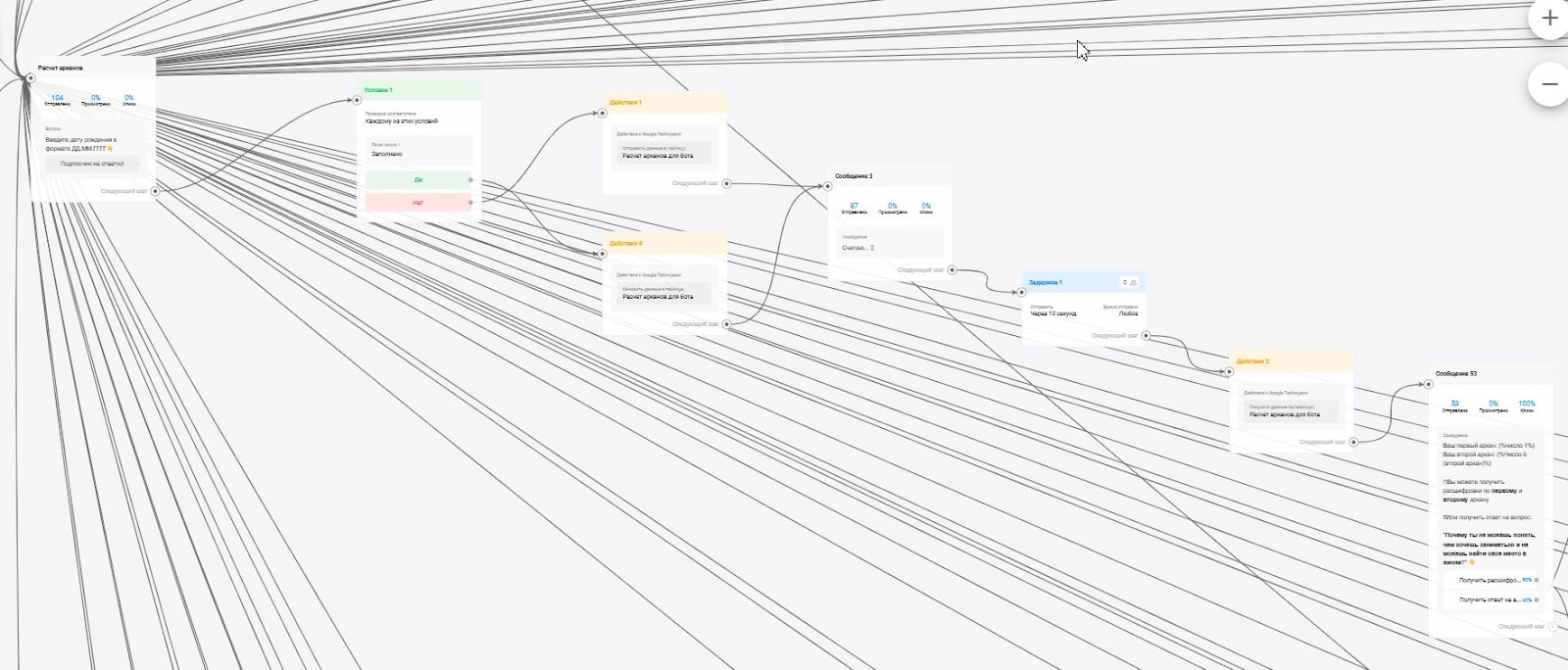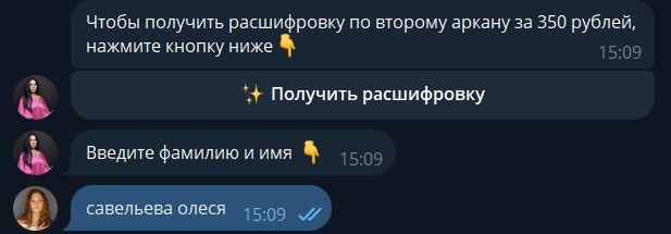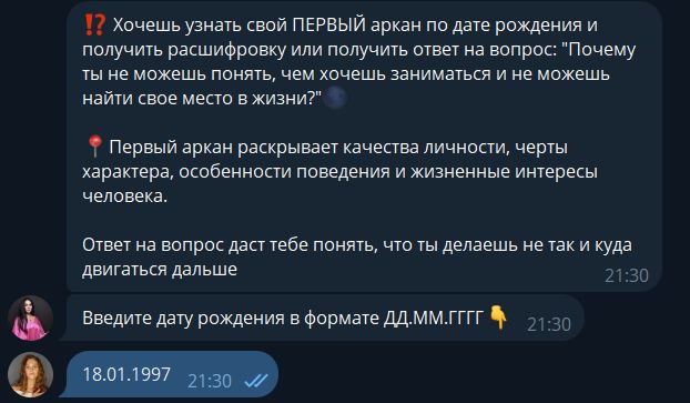 - В результате был сделан бот-воронка для таролога, который плавно подводит к покупке основного продукта клиента через лид-магнит — расчёт арканов по дате рождения через гугл-таблицу с бесплатной выдачей расшифровки арканов и трипваера — более подробной расшифровки арканов за небольшую стоимость;