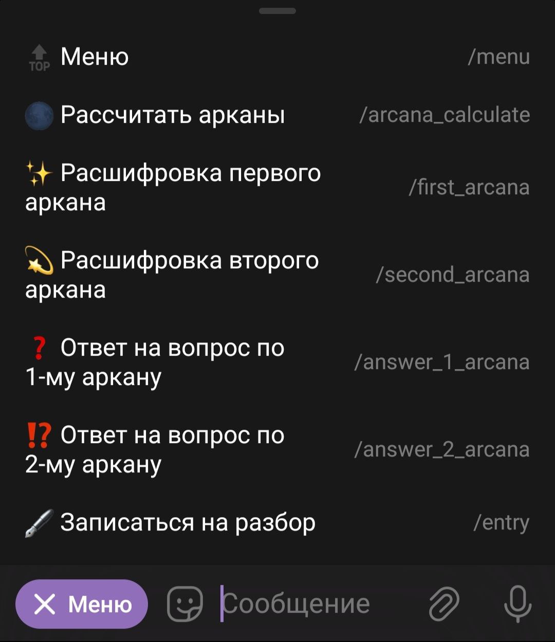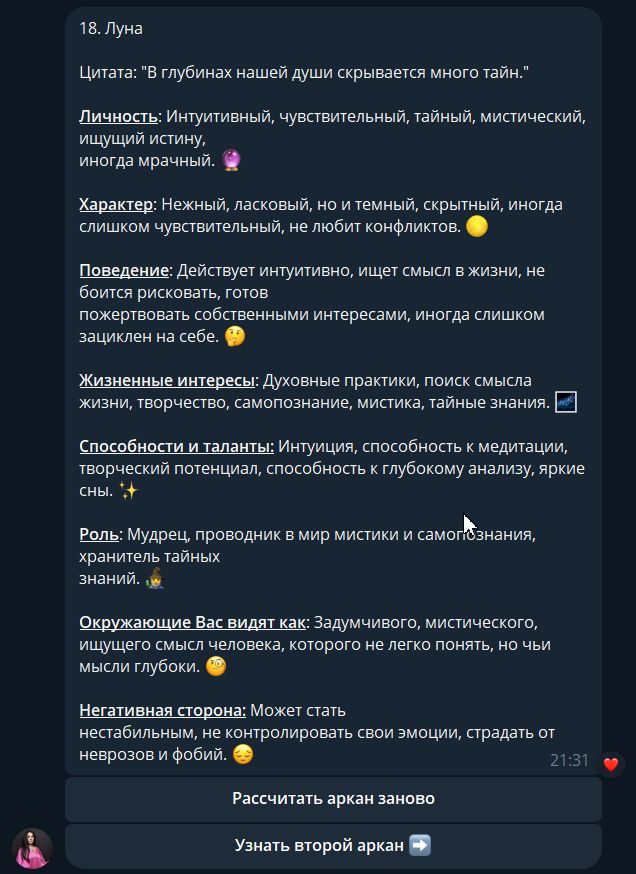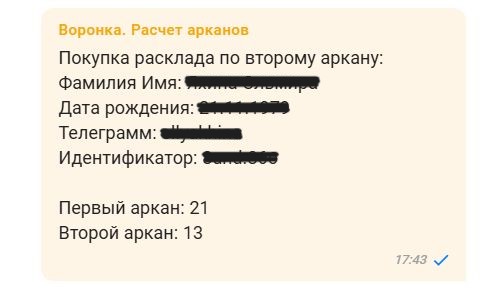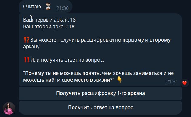 Основной запрос клиента: клиент — таролог, обратился с просьбой сделать бота-воронку, который высчитывает 2 числа (далее — арканы) по дате рождения, бесплатно выдаёт информацию в зависимости от полученного значения, затем предлагает купить более подробный разбор аркана за небольшую стоимость, после чего предлагает купить основной продукт специалиста.