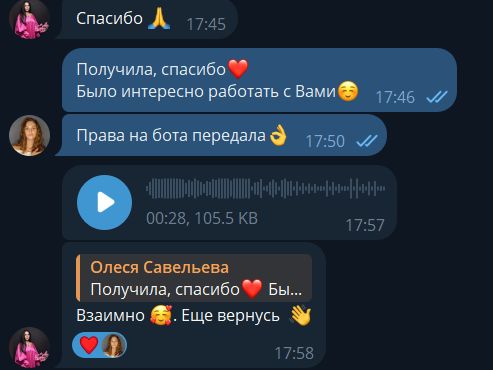 Отзыв не заставил себя долго ждать. Чат-бот клиенту очень понравился, он остался довольным. Клиент в дальнейшем хочет сотрудничать на следующих проектах: