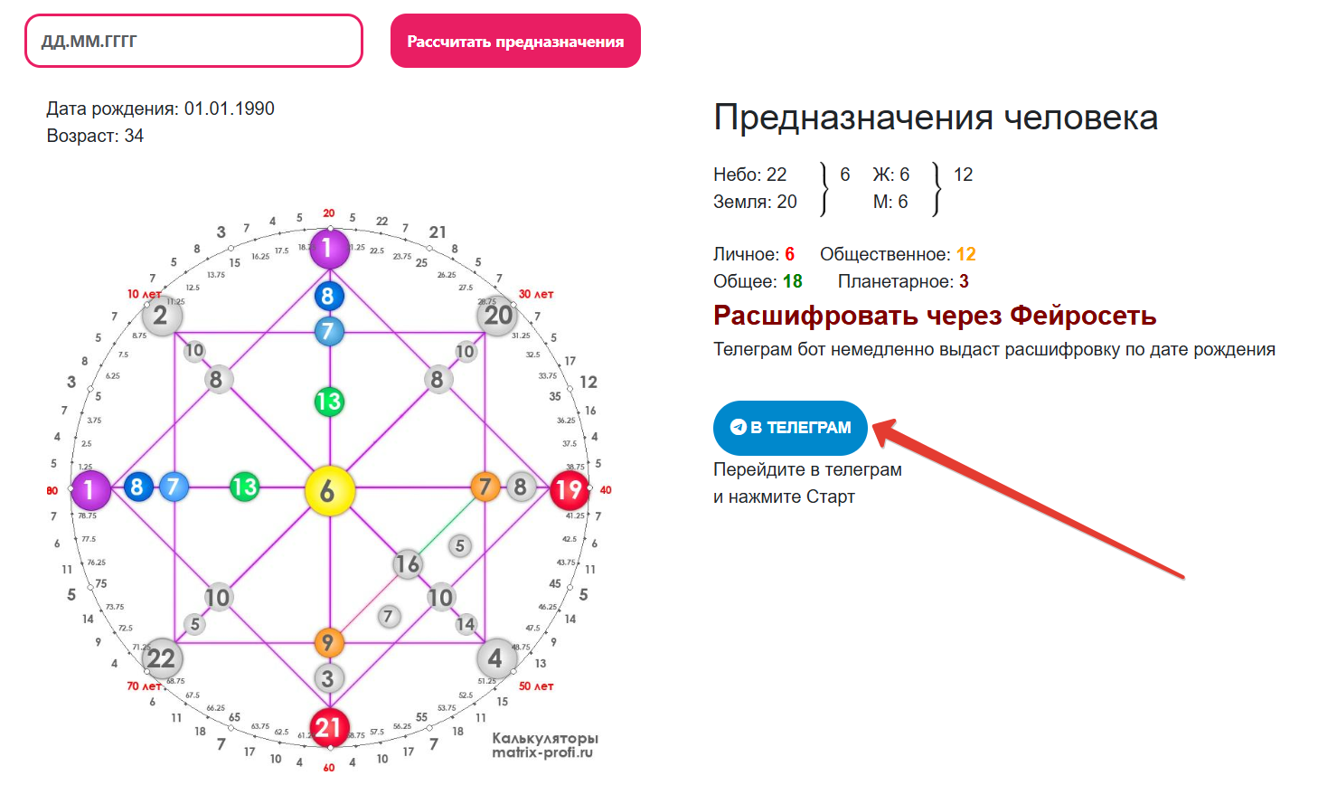 - Потенциальный клиент переходит на сайт через поисковые системы, делает расчёт, а далее ему предлагается кнопка получить расшифровку в Telegram. В качестве примера — калькулятор по расчёту предназначения: