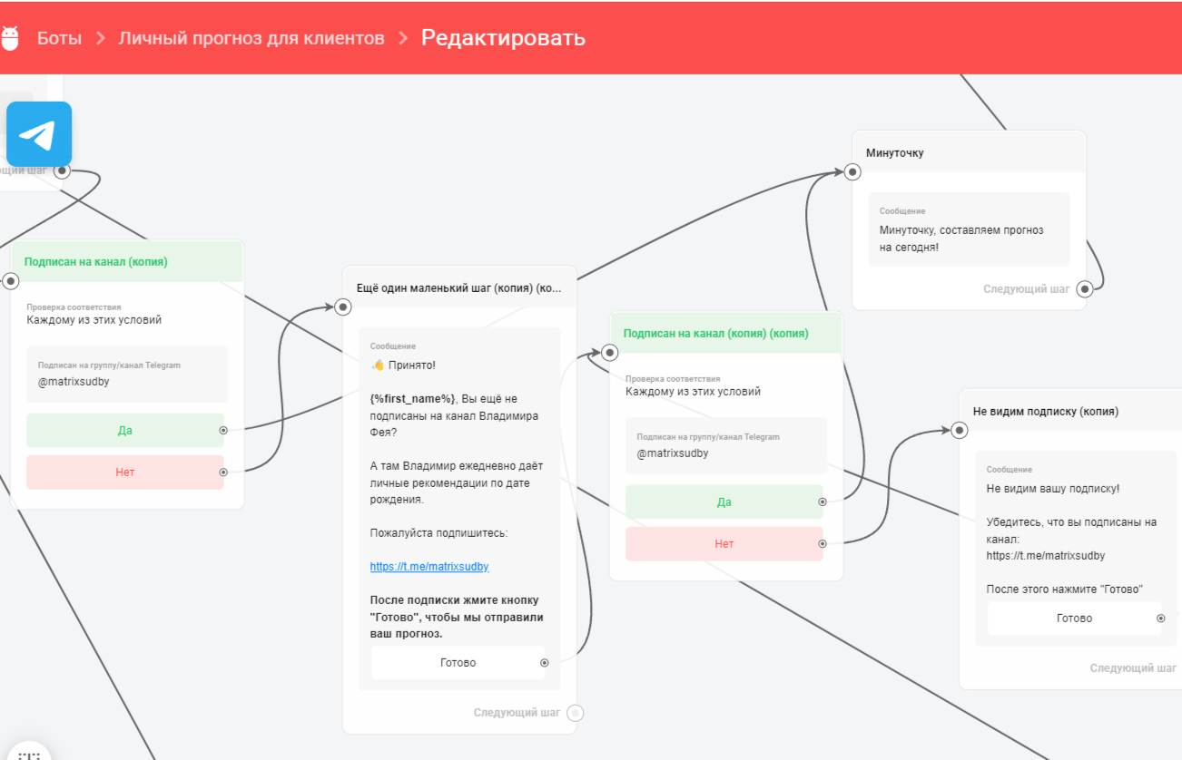 - Ввели бот по расчёту прогноза на день, который клиент может запустить каждый день, чтобы рассчитать свой прогноз по дате рождения. Таким образом, подписчик не может отписаться от канала, если хочет получать расчёты каждый день.