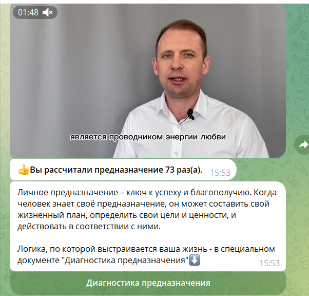 - После вычисления предназначения (число) данные отправляются обратно в бот, и он выдаёт значение числа личного предназначения. Далее следует расшифровка этого числа и короткое видео с Владимиром.