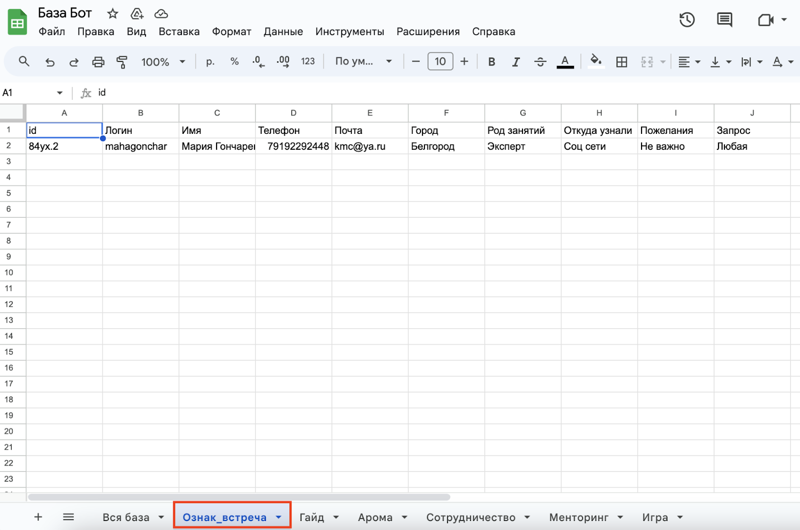 Далее данные передаются в Google Таблицу в соответствующий раздел.