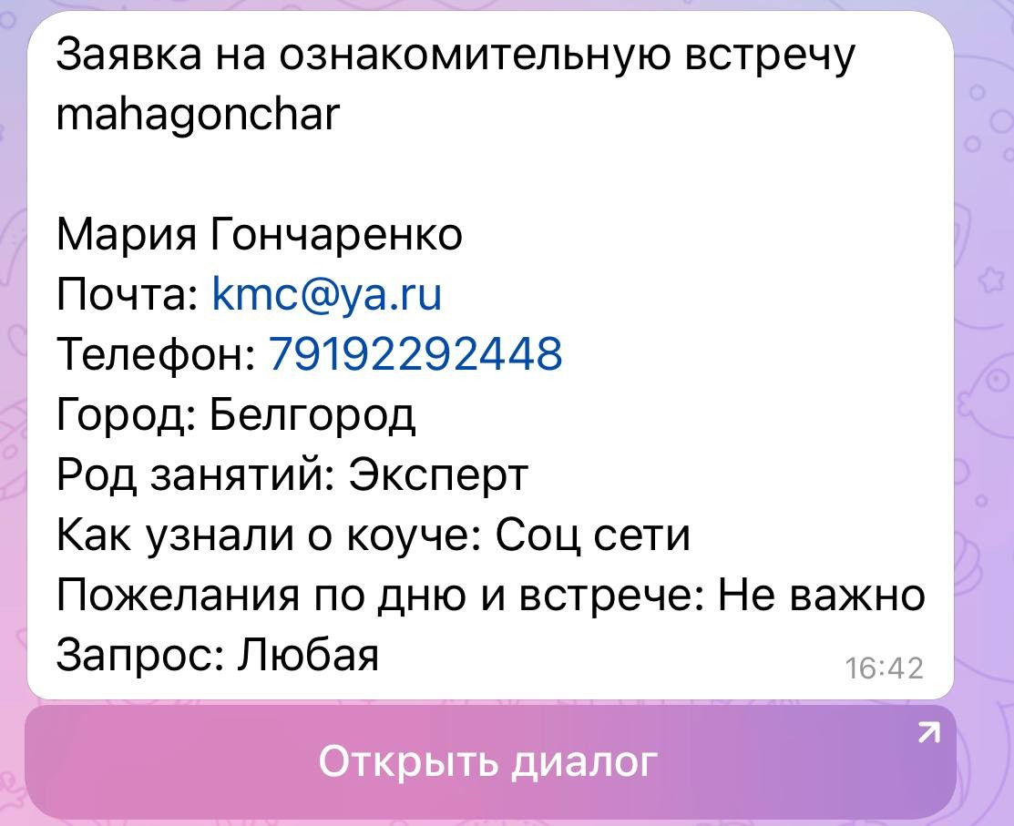 - Все сообщения о новых заявках на консультацию отправляются напрямую эксперту в Telegram.