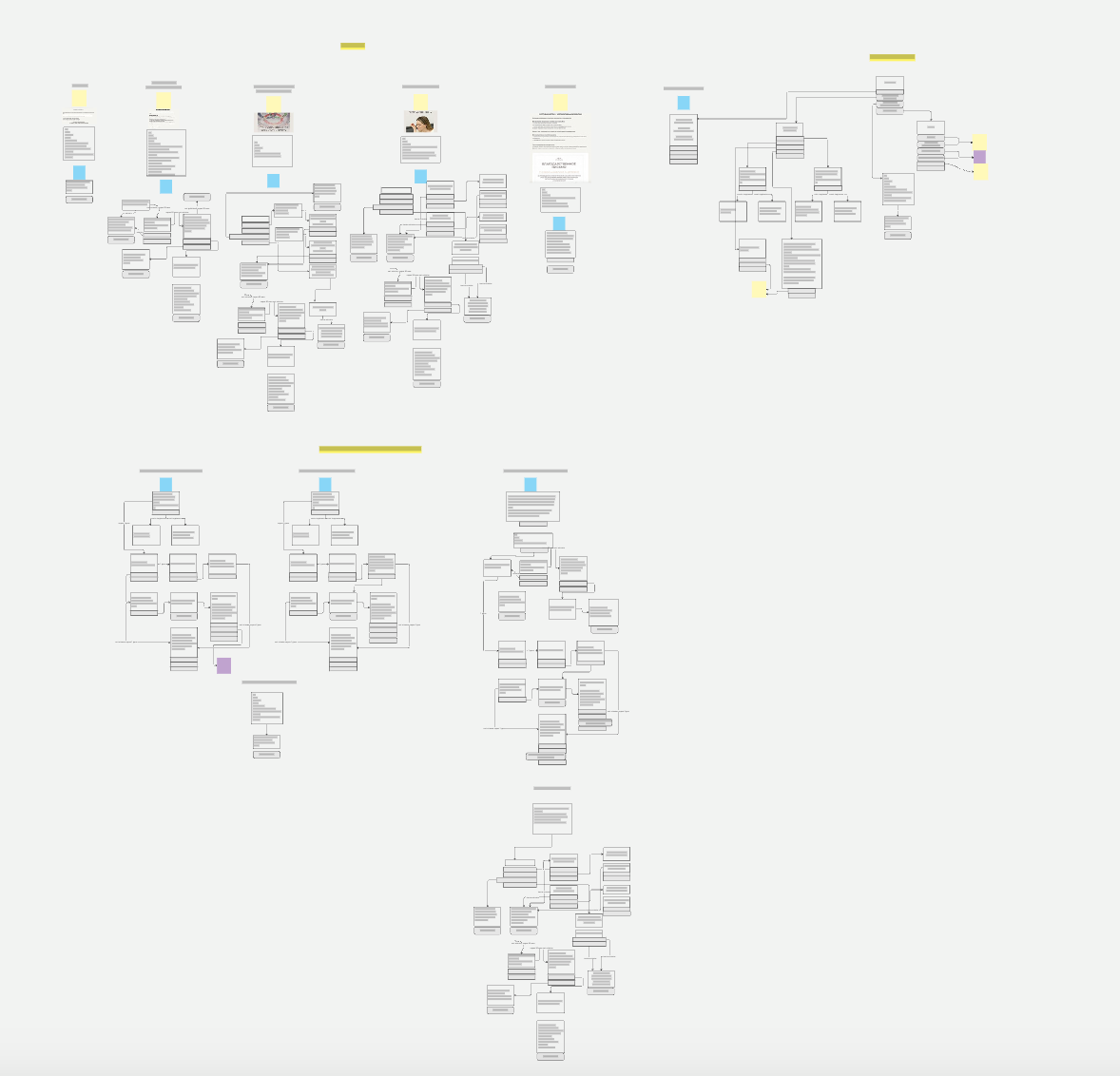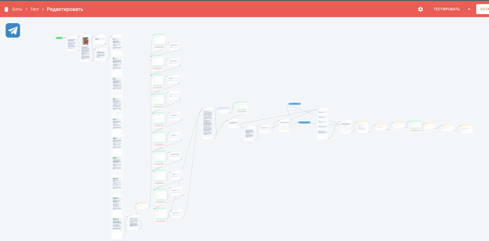 1) Был составлен подробный план, который включал несколько воронок через онлайн-майнд-карту Miro. Тезисно прописаны тексты, проверки, где должны были приходить уведомления, передаваться данные в таблицу. Таким образом, эксперт мог вставить нужный текст, согласовать воронки/действия/шаги пользователей и сделать соответствующие правки.