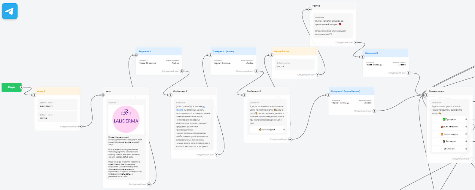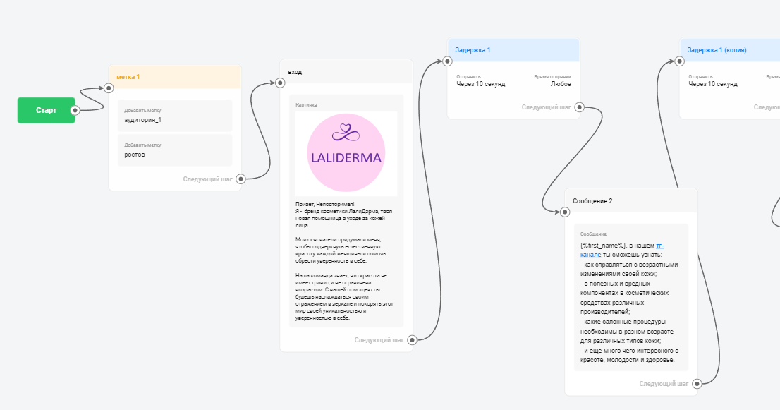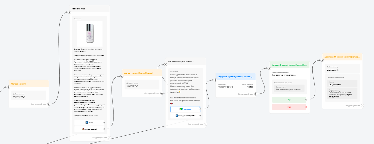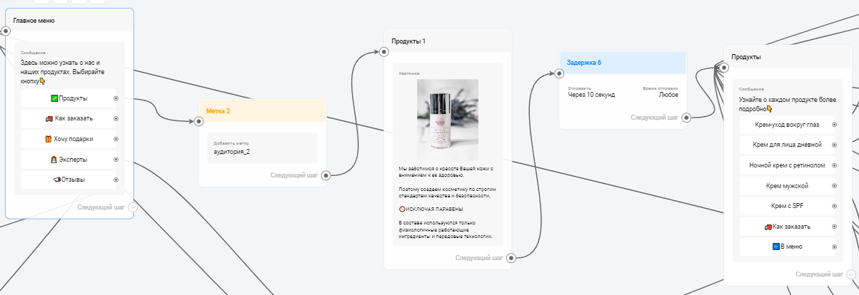 - Персонализация и метки: в боте каждому клиенту по степени его заинтересованности автоматически проставлялись метки. Это позволяло отправлять целевые рассылки и предложения.
