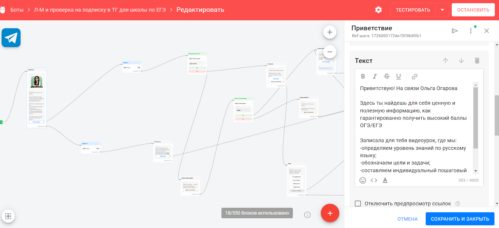 — Бот общается от имени эксперта. Мотивирует пользователей через приветственное сообщение.