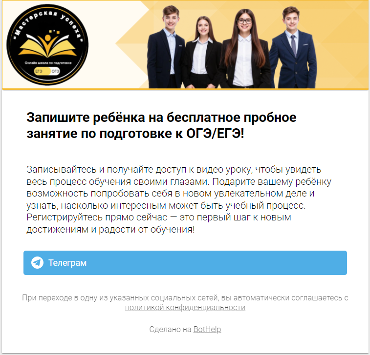 Текст должен был заинтересовать наших потенциальных учеников, мотивировать подписаться на бота и оставить свои данные.