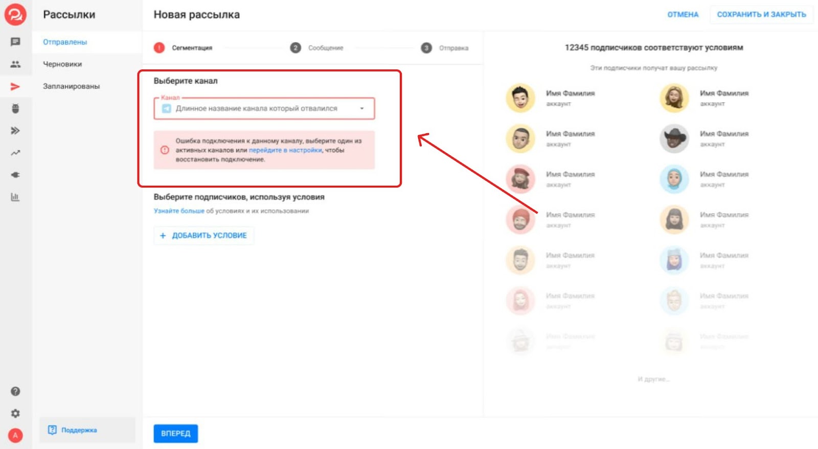 Нажав на плашку «Ошибка подключения», вы сразу перейдёте в раздел «Каналы» и сможете его переподключить. А для Telegram теперь достаточно просто повторно ввести токен.
