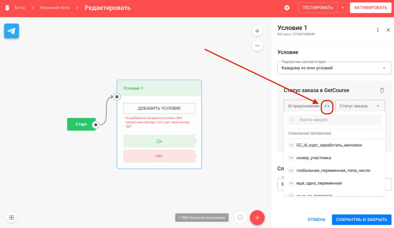 Мы добавили возможность использовать глобальные переменные в поле «id предложения» в «Статусе заказа GetCourse». Теперь подготовка ботов к новым запускам станет значительно быстрее. Достаточно один раз обновить значение в разделе «Глобальные переменные».