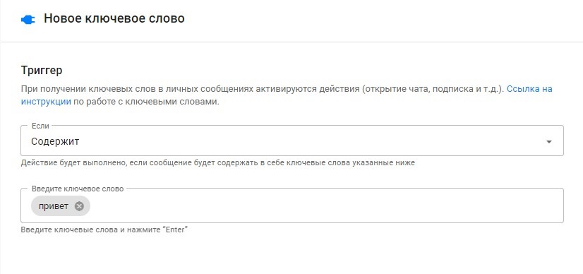 Выбрав вариант «Содержит», вы можете настроить запуск бота или авторассылки, если сообщение от пользователя будет содержать в себе какое-то слово, т.е. теперь можно не бояться лишних символов рядом с ключевым словом.