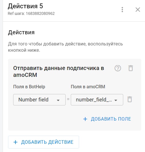 Автоматическая отправка данных в amoCRM настраивается через блок «Действие» в конструкторе ботов.
