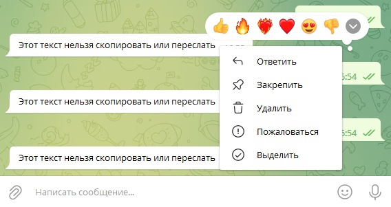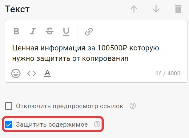 Для того чтобы защитить контент, поставьте галочку рядом с надписью «Защитить содержимое» в карточке «Текст» блока «Сообщение»: