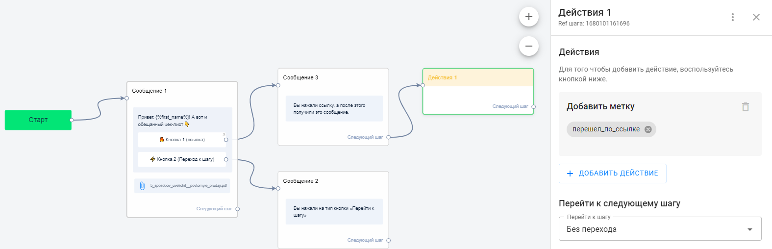 - Перейти к шагу — нажав на неё, пользователь перейдёт на тот шаг в боте, который вы укажете.