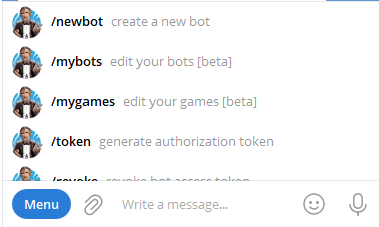 Нажмите кнопку Menu рядом с полем для ввода текста и выберите команду /newbot.