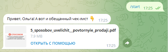 Отлично! Ваш первый бот готов! Он умеет обращаться к подписчику по имени и отправлять сообщение с файлом всем, кто его активирует.