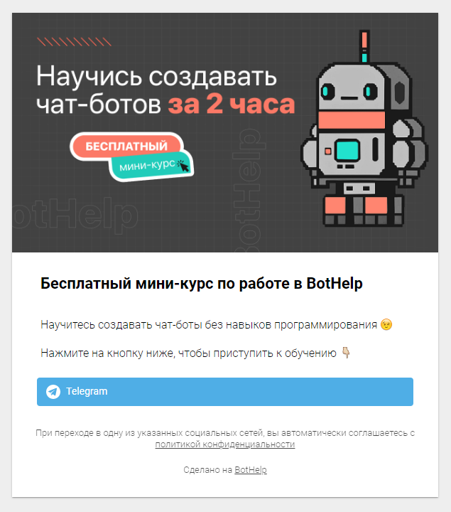 Вернёмся к нашему боту. Будущие подписчики должны в него как-то попасть. Один из способов — использовать мини-лендинг.