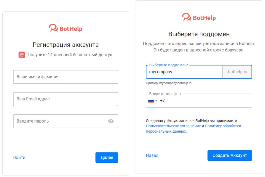 Вы увидите окно, в которому нужно ввести ваши имя и фамилию, email и придумать пароль. В следующем окне введите номер телефона и придумайте поддомен — адрес вашего будущего кабинета в BotHelp.