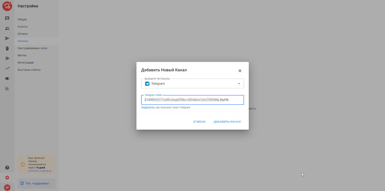 Дальше выберите мессенджер, который хотите подключить. В нашем случае это Telegram. И введите тот самый токен, который вы сохранили из диалога с BotFather.
