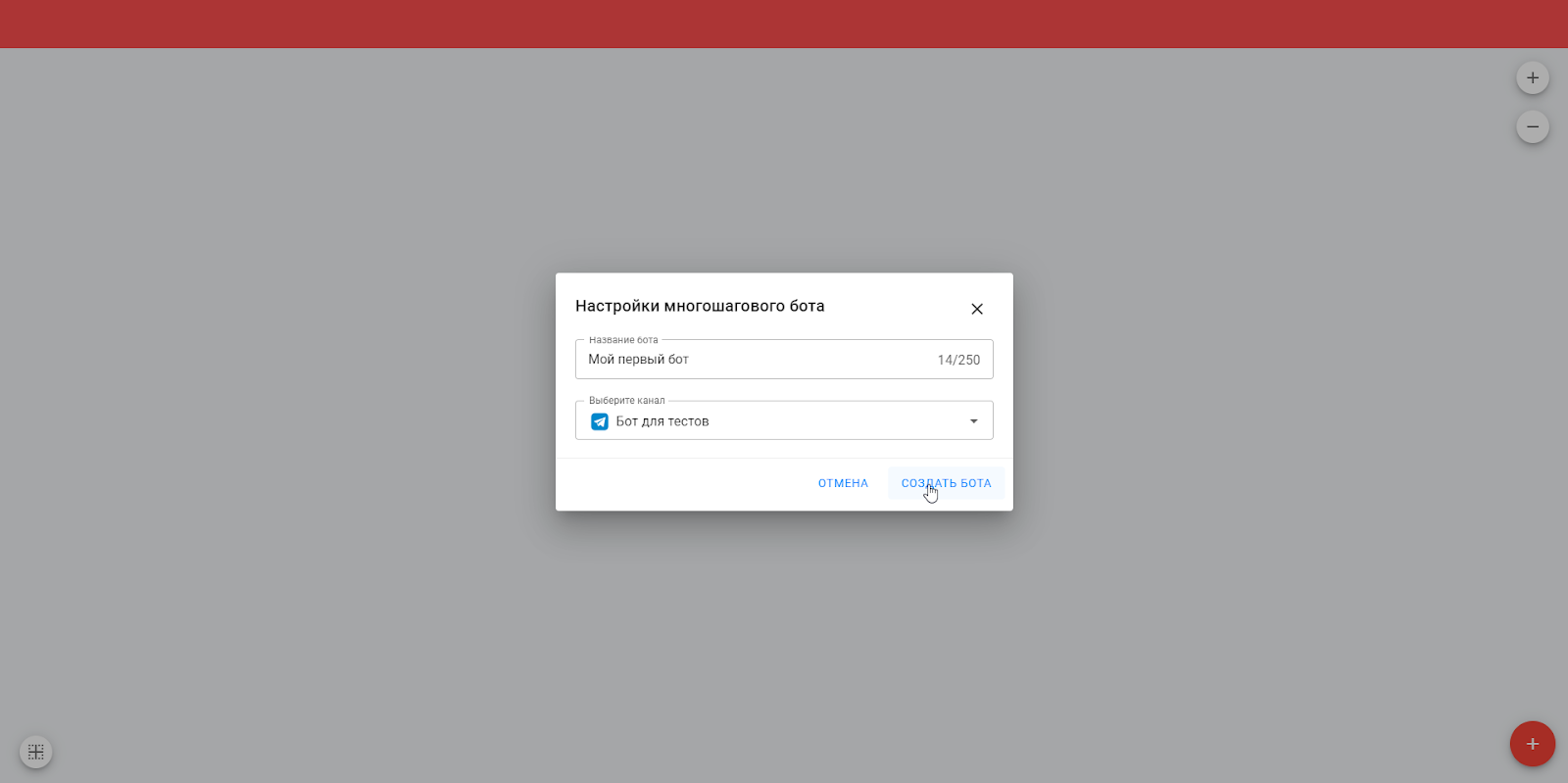 Вы попадёте в простой и понятный конструктор чат-ботов. Придумайте название для своего бота. Убедитесь, что в строке выбора канала именно тот бот, которого вы только что подключили. Нажмите «Создать бота».