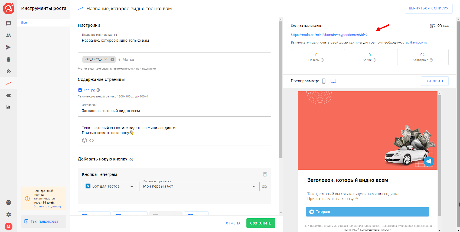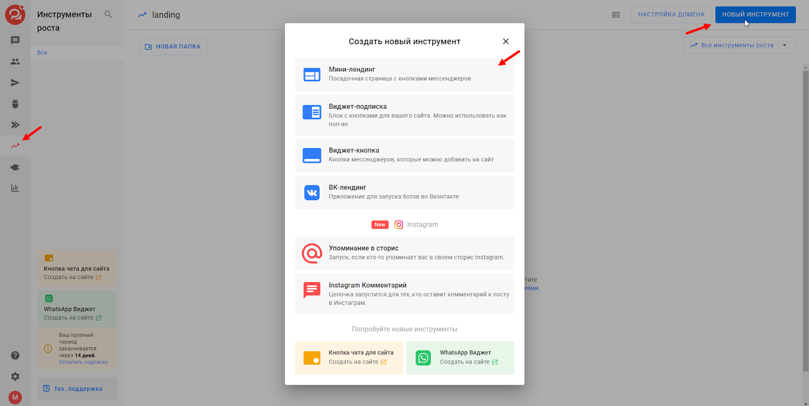 Чтобы создать мини-лендинг, перейдите в раздел «Инструменты роста» (стрелка в левом меню) и нажмите на кнопку «Новый инструмент» → «Мини-лендинг».