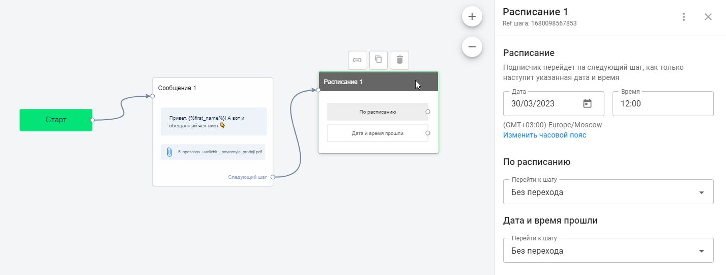 Как и шаги «Действия», шаги «Задержка» не видны пользователям, как текстовые сообщения. Они нужны для внутренней настройки цепочки. Этот блок позволяет отправить следующее сообщение через N секунд, минут, часов или дней.