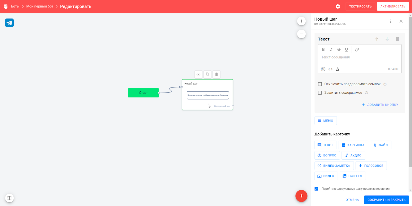 Перед вами стартовый шаг и блок «Сообщение». Все шаги выполняются от старта и далее по направлению стрелок.
