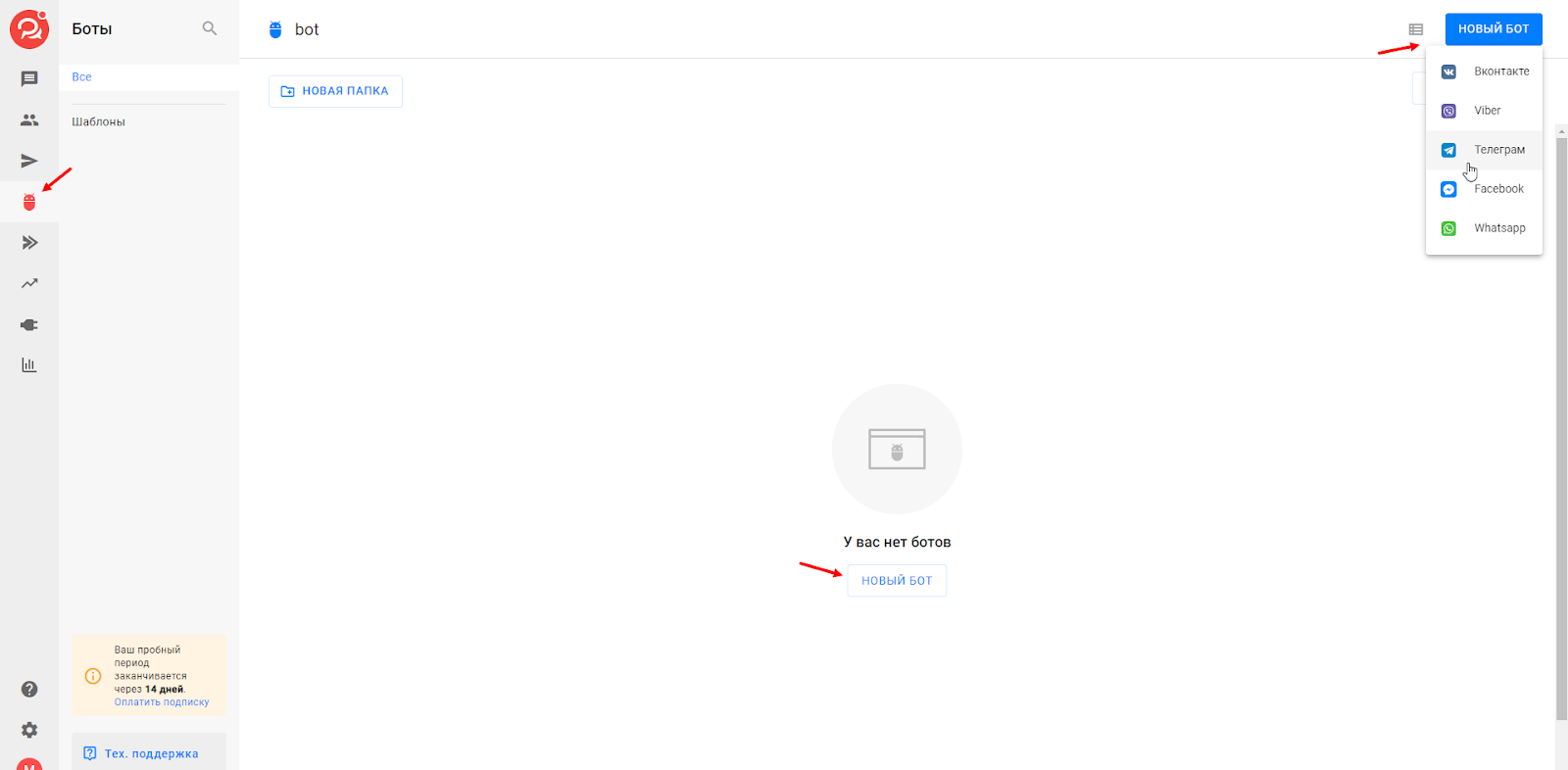 Нажмите на значок робота в меню слева, чтобы попасть в раздел «Боты». Дальше «Новый бот» → Telegram.