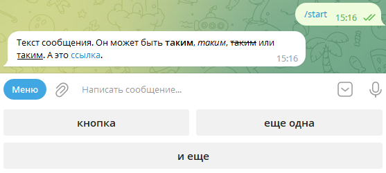 В BotHelp для Telegram доступно форматирование текста: жирный, курсив, подчёркнутый, зачёркнутый, ссылка. Можете выделить важные пункты или ключевые мысли, чтобы обратить на них внимание подписчиков.
