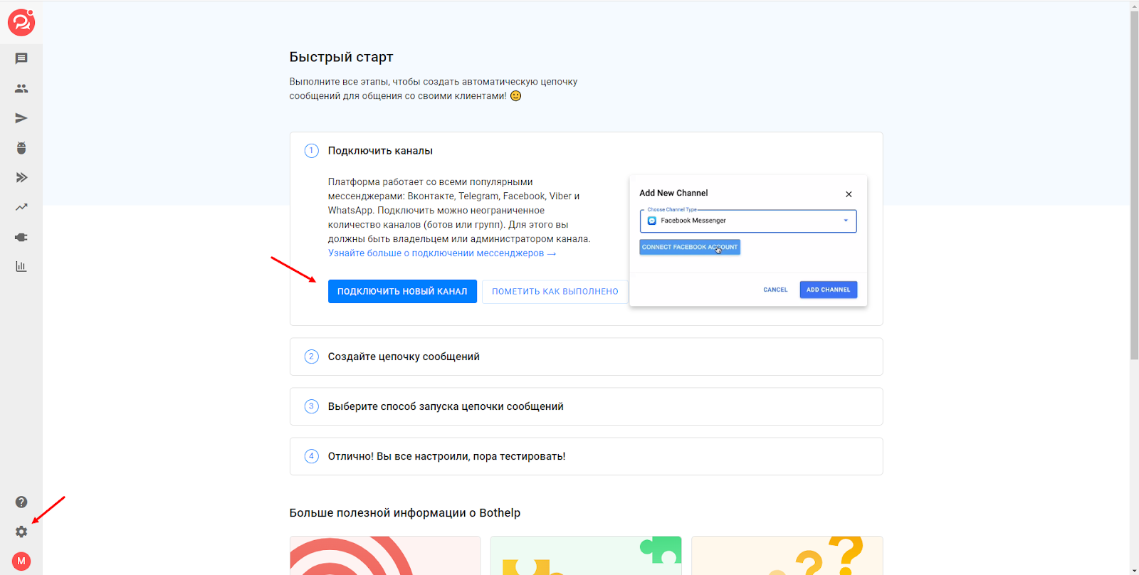Сразу после регистрации вы попадёте на страницу быстрого старта. Нажмите кнопку «Подключить новый канал». Или перейдите в настройки, нажав на шестерёнку снизу слева → Каналы → Добавить новый канал.