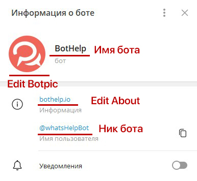 ✔ Для добавления описания в профиле бота нажмите на Edit About и вводите текст. Кратко опишите, что это за бот. Можете добавить ссылку на сайт.