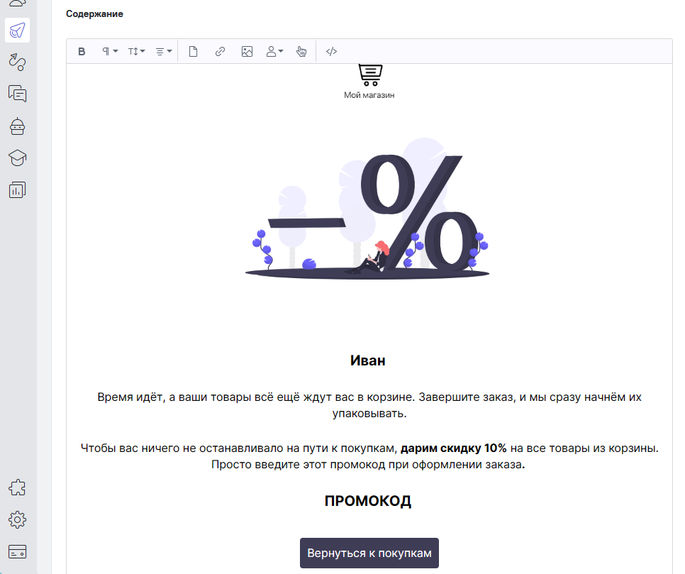- Можно отправлять триггерные цепочки писем (автоматические письма, которые отправляются в ответ на определенное действие или событие пользователя: приветствие, брошенная корзина и т. д.).